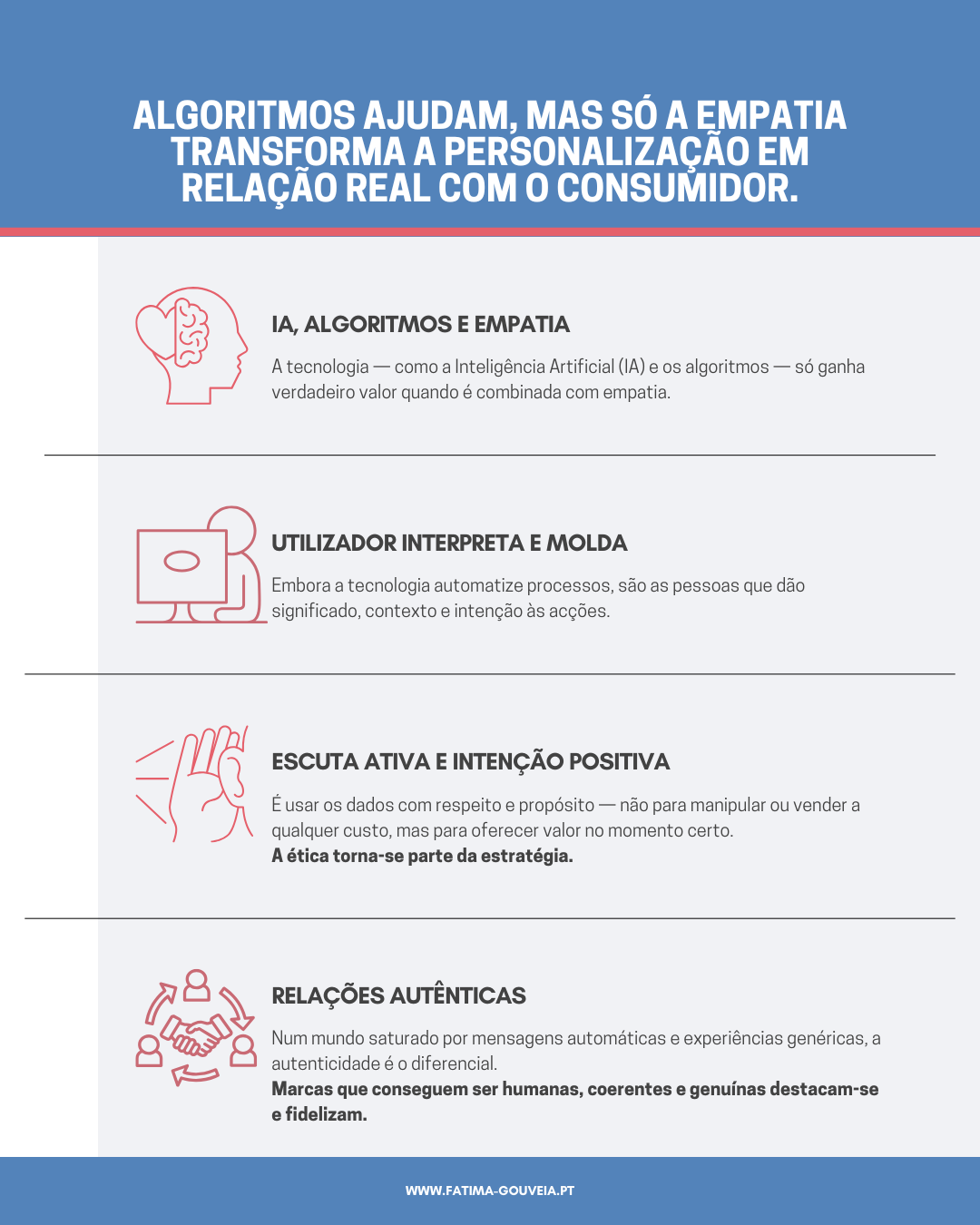 A inteligência artificial pode prever comportamentos. Os algoritmos podem segmentar com precisão. Mas a diferença, em 2025, está na empatia: a capacidade de compreender e agir com sensibilidade às necessidades do outro. A personalização 2.0 não vive só de dados, vive de contextos, emoções e escolhas.